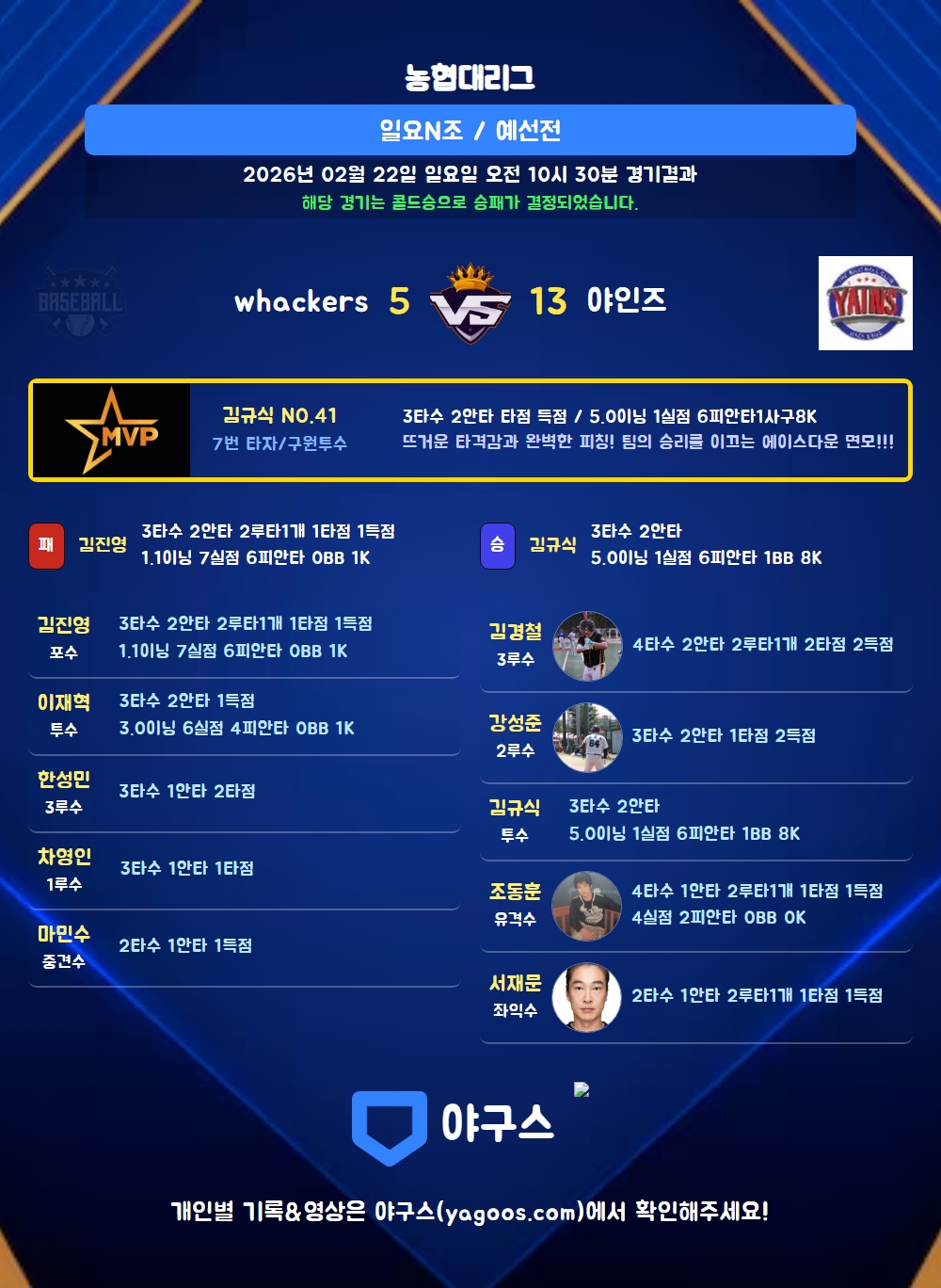 | 야인즈 | 3 | 4 | 2 | 2 | 2 | 13 | 10 | 1 | 10 | 7 |
