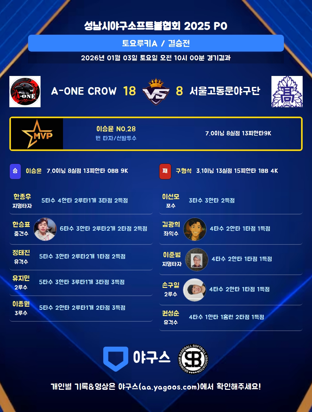 | 서울고동문야구단 | 0 | 3 | 1 | 2 | 0 | 2 | 0 | 0 | 8 | 13 | 5 | 0 | 4 |