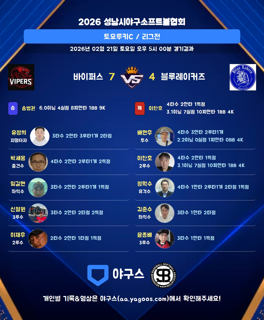 | 블루레이커즈 | 2 | 0 | 0 | 0 | 0 | 2 | 0 | 4 | 8 | 1 | 3 | 9 |