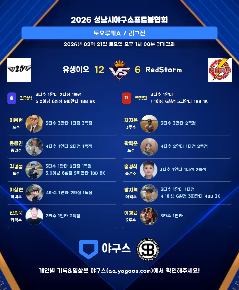 | 8 | 二 | 김진혁(99) | 투땅 | - | - | 2땅 | - | 4구/유내안 | 3 | 1 | - | 2 | - | 1 | 1 | - | 0.333 |