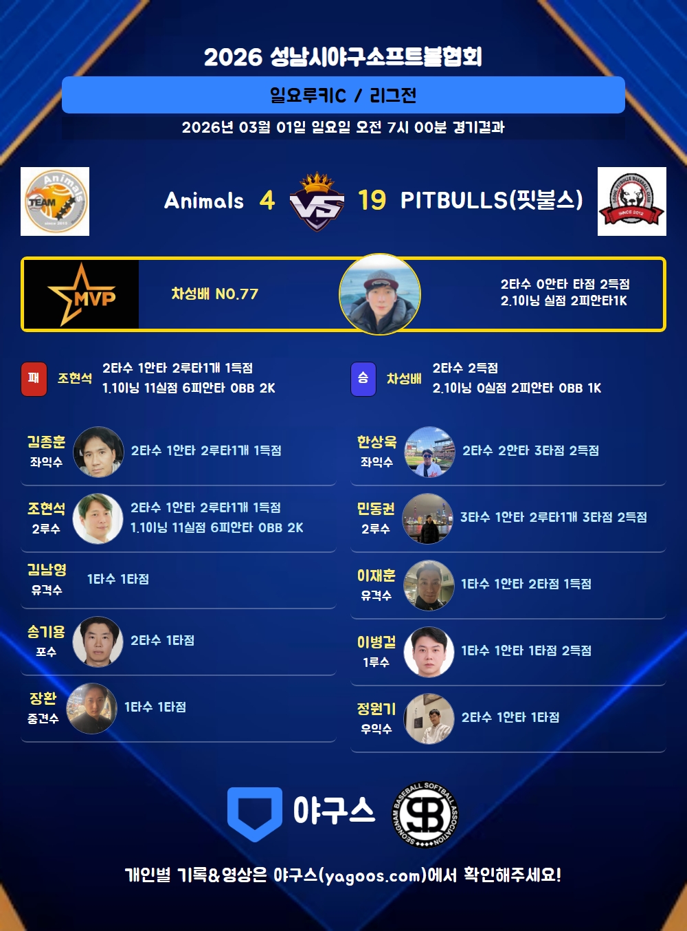 | 1 | 차성배(77) | 승 | 2.1 | 10 | 10 | 2 | - | - | 1 | 12 | - | - | 0 |