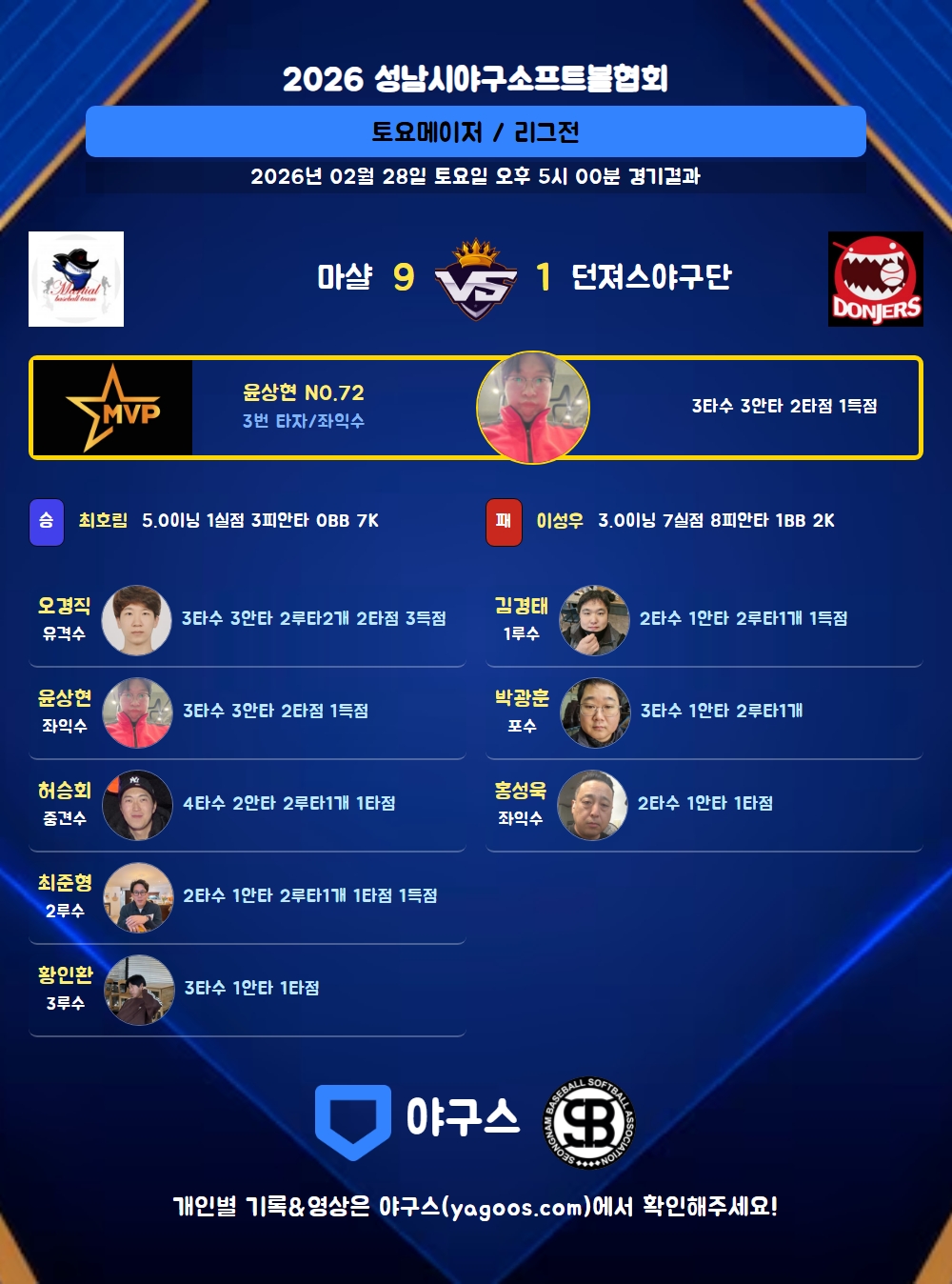 | 던져스야구단 | 0 | 1 | 0 | 0 | 0 | 0 | 1 | 3 | 1 | 3 | 6 |