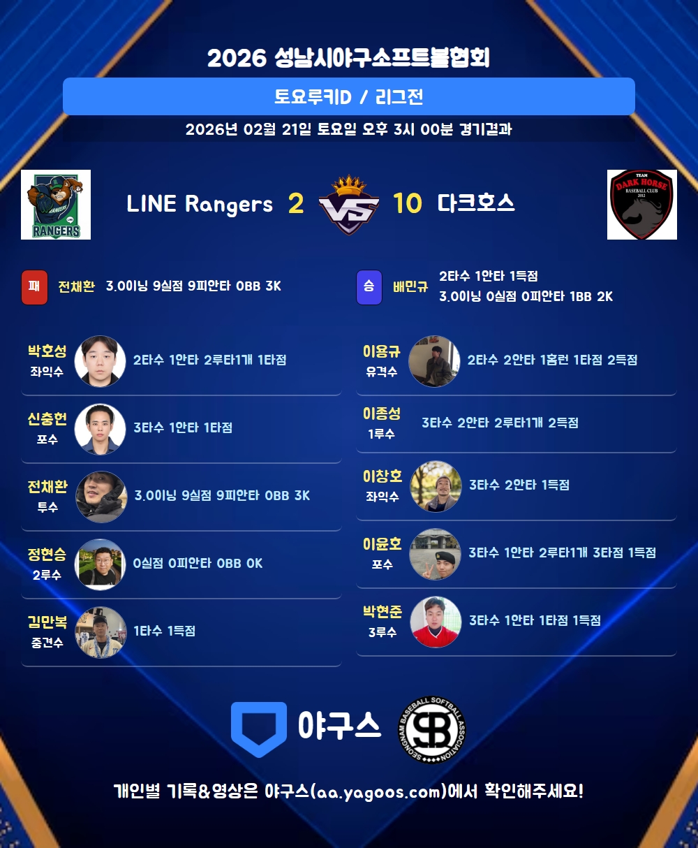 | 1 | 배민규(47) | 승 | 3.0 | 11 | 9 | - | - | 2 | 2 | 18 | - | - | 0 |