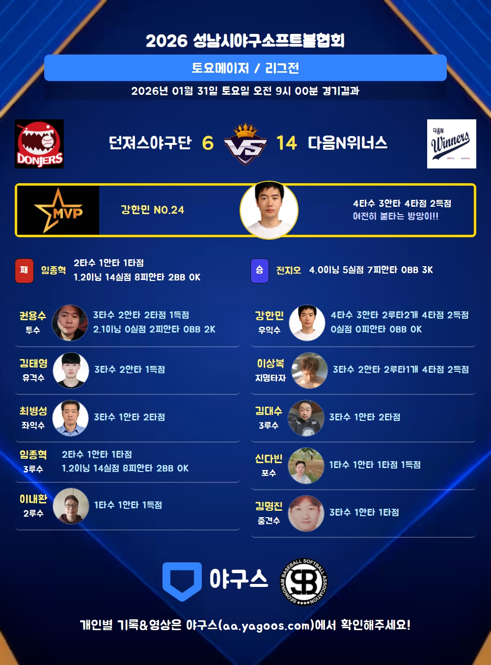 | 던져스야구단 | 0 | 5 | 0 | 0 | 1 | 6 | 9 | 2 | 1 | 5 |