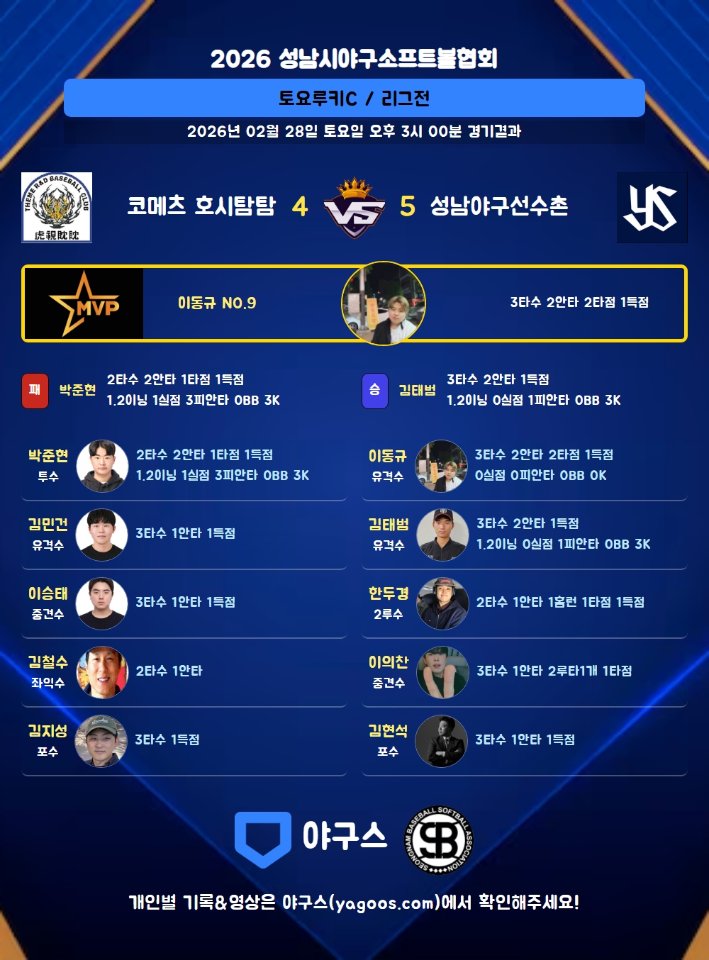 | 성남야구선수촌 | 3 | 1 | 0 | 0 | 1 | 5 | 9 | 1 | 1 | 3 |