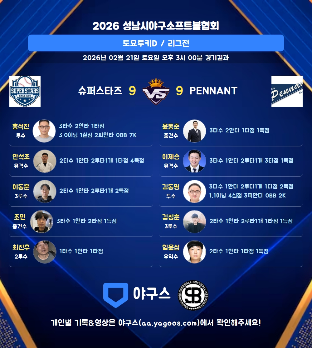 | 슈퍼스타즈 | 1 | 2 | 2 | 4 | 0 | 9 | 6 | 1 | 12 | 11 |