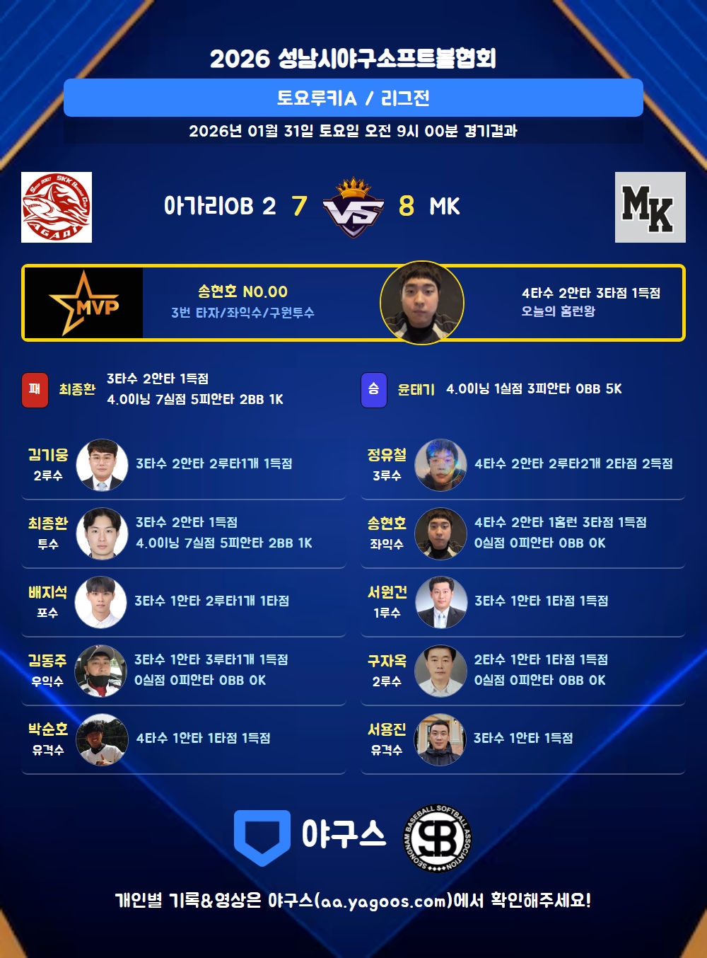 | 2 | 좌 | 송용주(28) | 삼진 | - | 좌안 | 4구 | - | 1땅 | - | 3 | 1 | - | 2 | - | 1 | 1 | 1 | 0.333 |