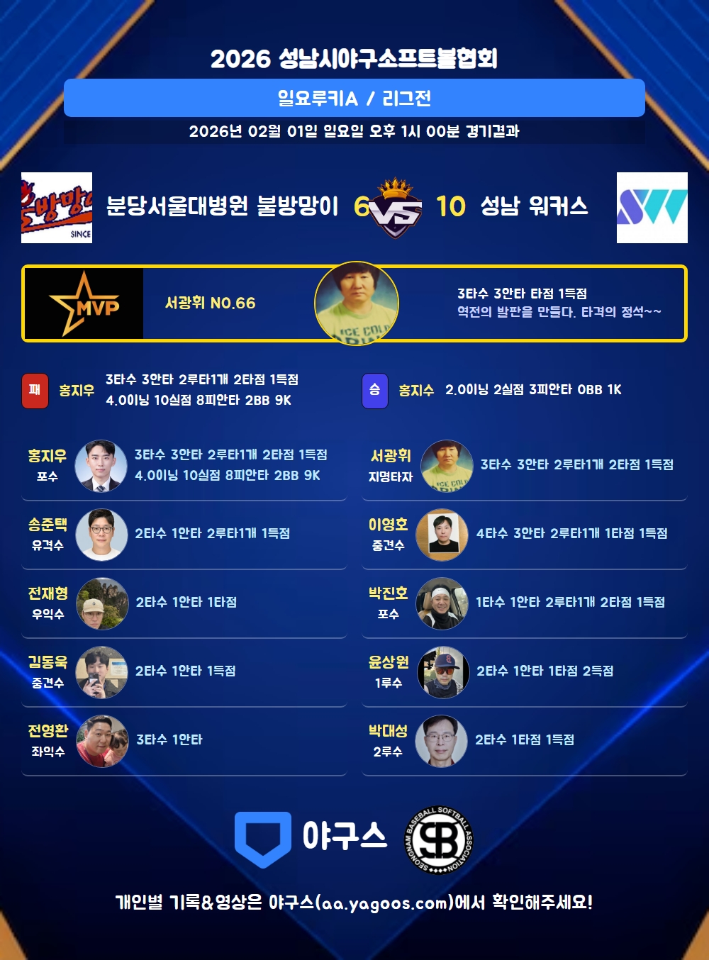 | 성남 워커스 | 1 | 1 | 0 | 8 | 0 | 10 | 8 | 1 | 7 | 6 |